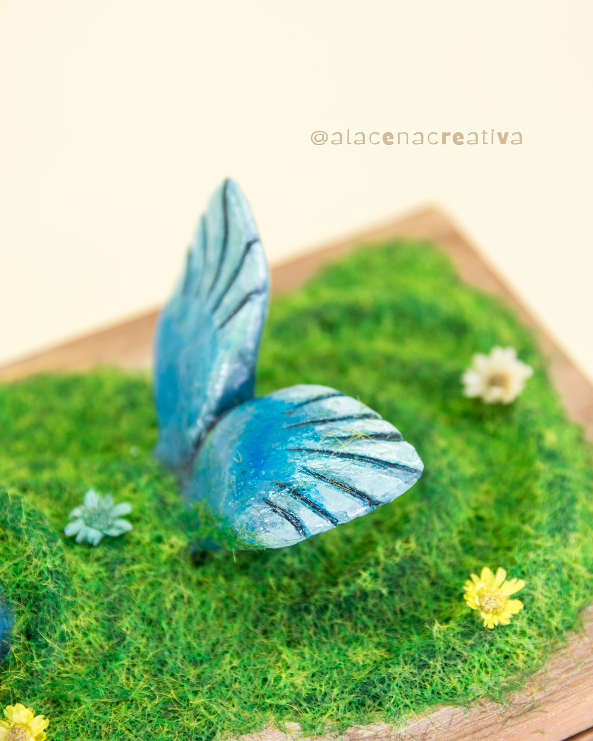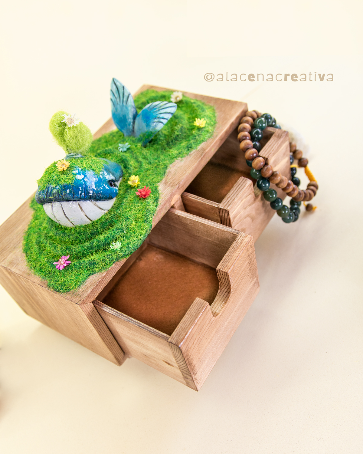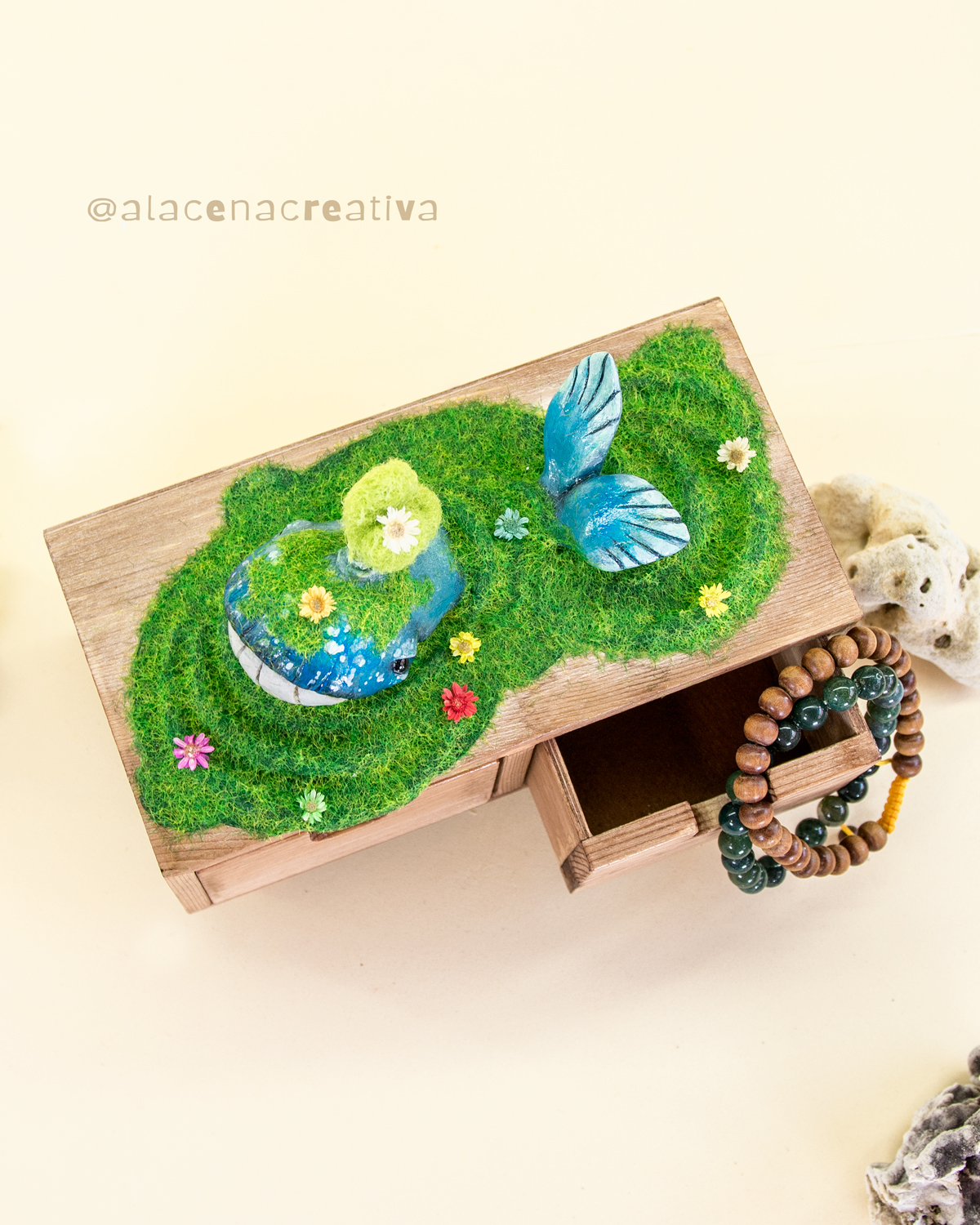 *Materiales: pasta de secado al aire, musgo y flores secas, mini cajonera de madera, fieltro interior.
