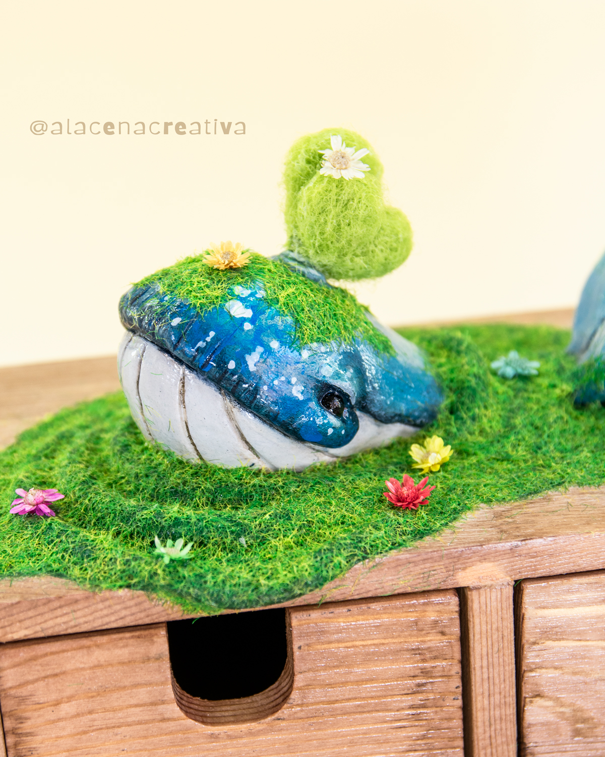 «Nami no nada, vigila. Bajo su lomo cubierto de musgo, esconde secretos y pequeñas maravillas del día a día. Como tú, sabes que lo esencial está dentro. A veces, la libertad cabe en un cajón. Esta ballena brota de un jardín marino para recordarte que hasta lo más pequeño puede contener mundos enteros.»