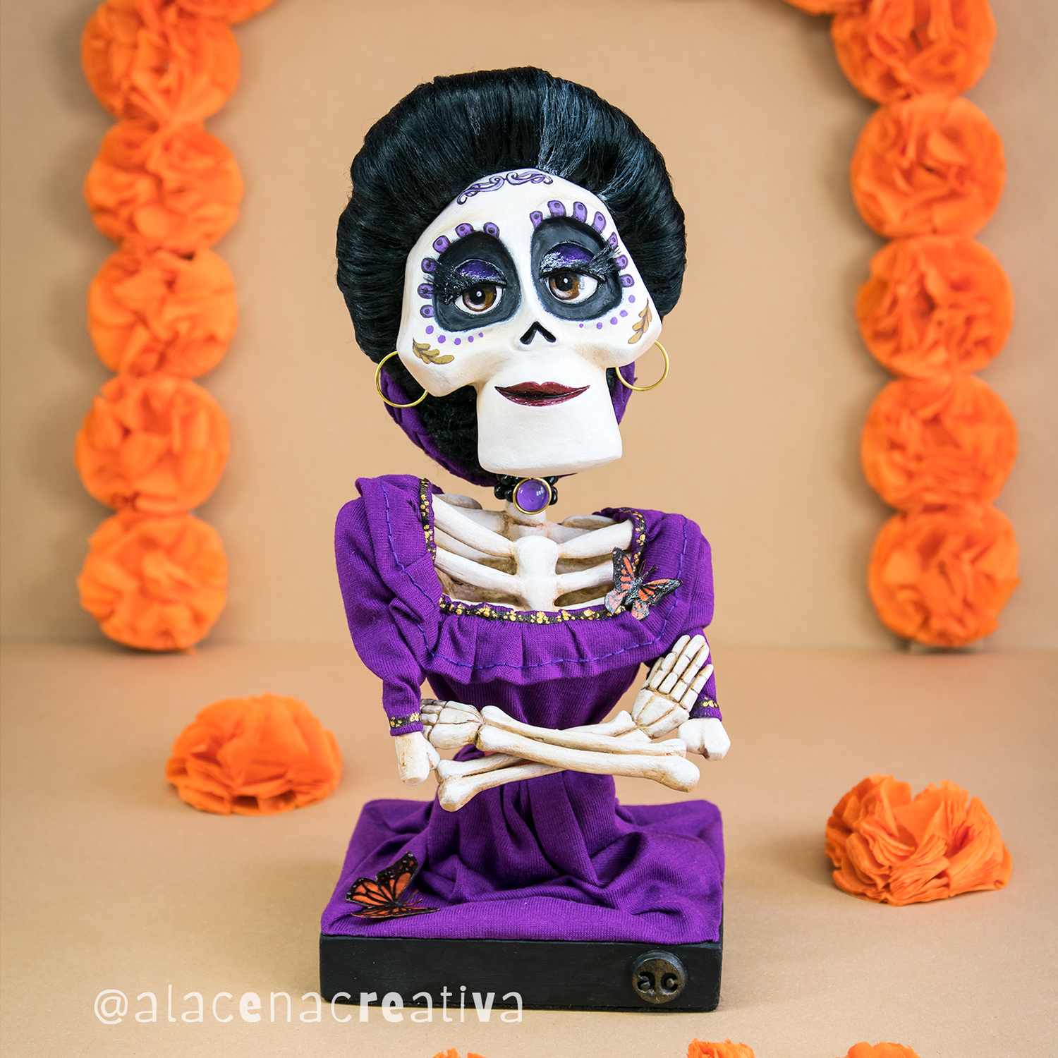 “No sé que tienen las flores, llorona, las flores del campo santo, que cuando las mueve el viento, llorona, parece que están llorando.” Figura fan art decorativa, inspirada en Mamá Imelda, personaje de la película Coco.