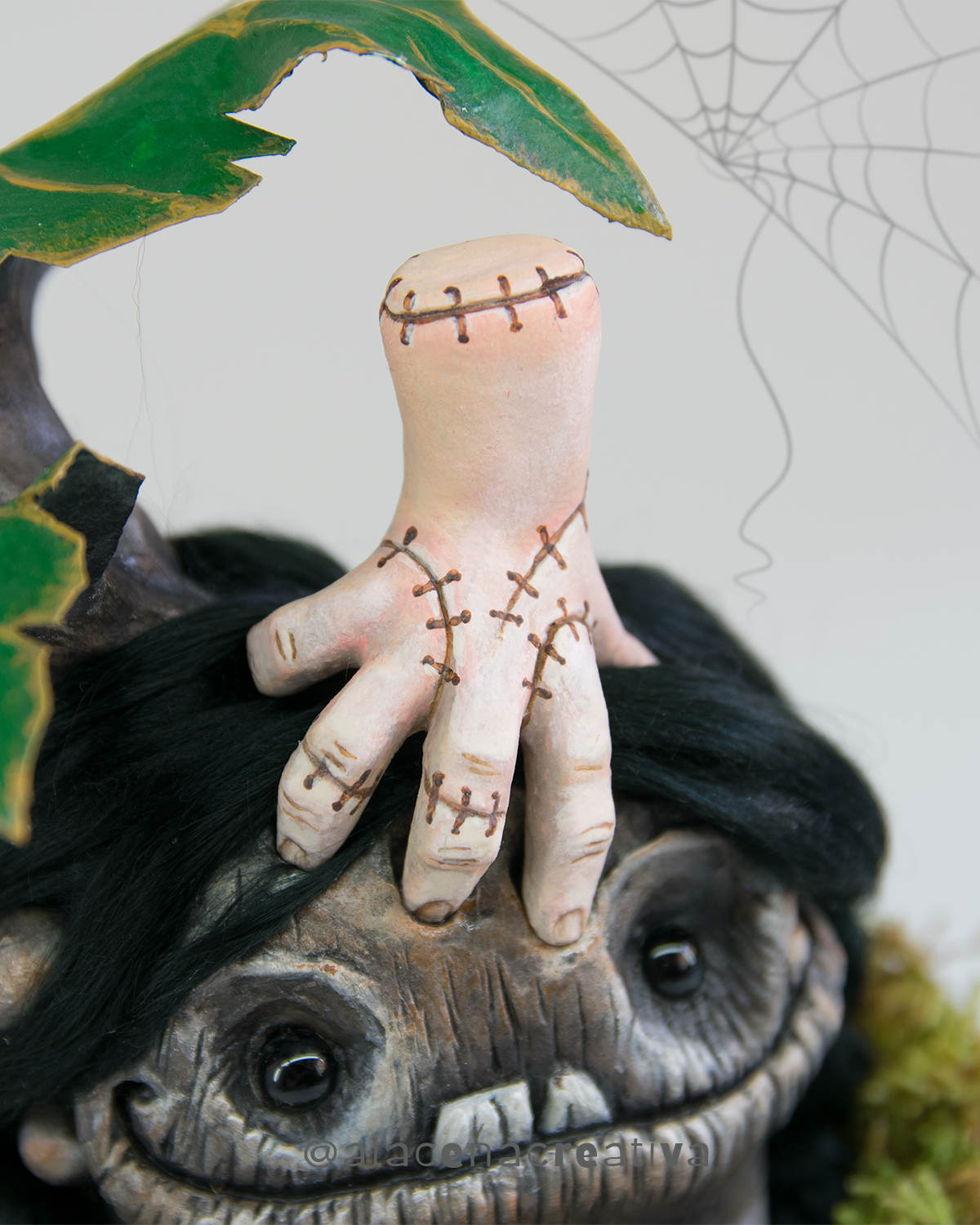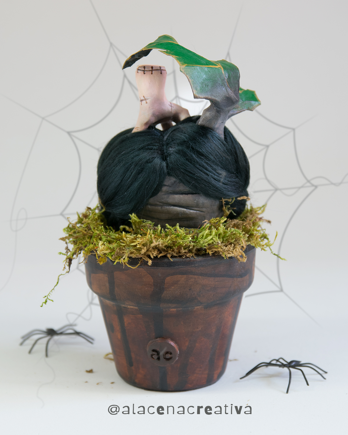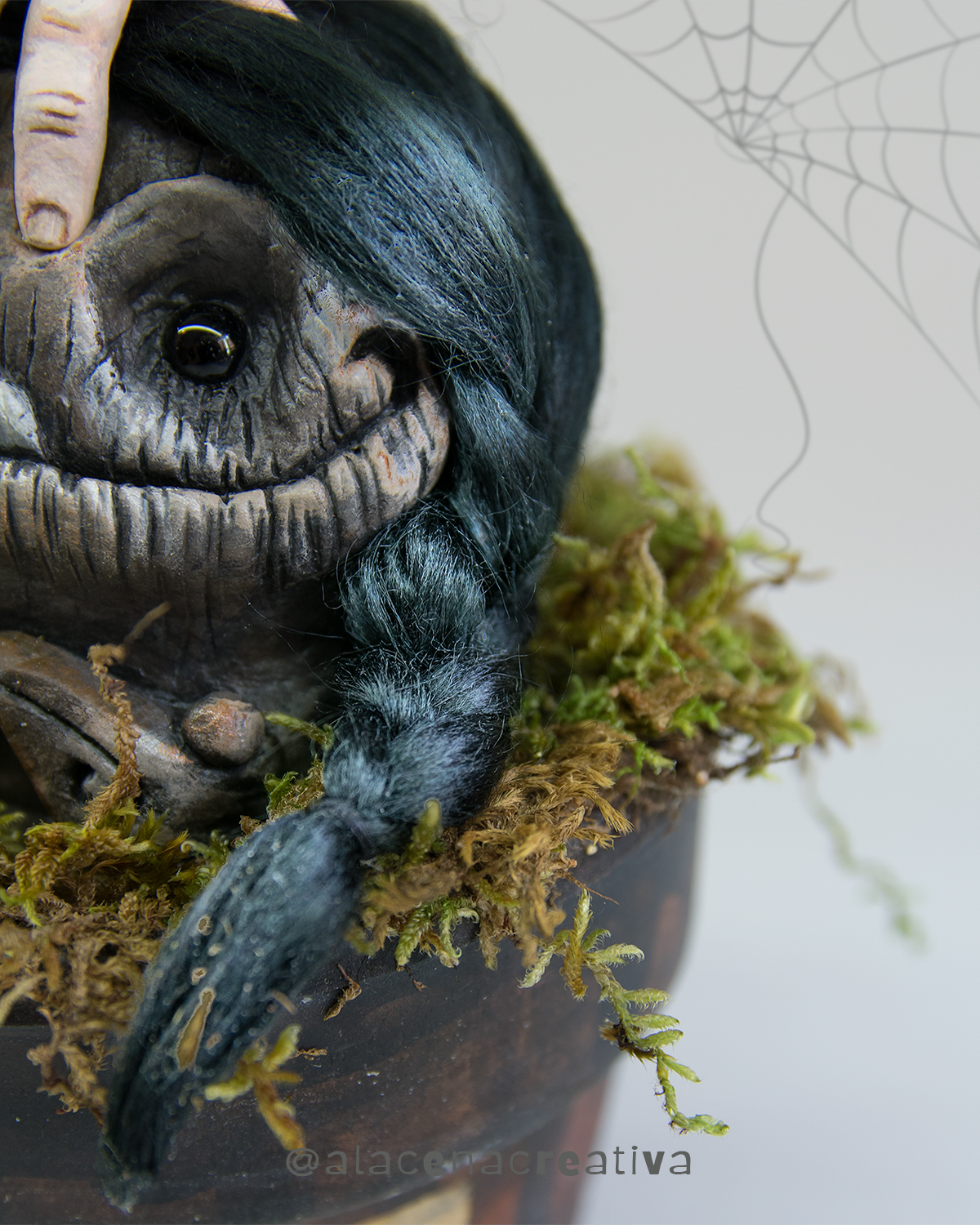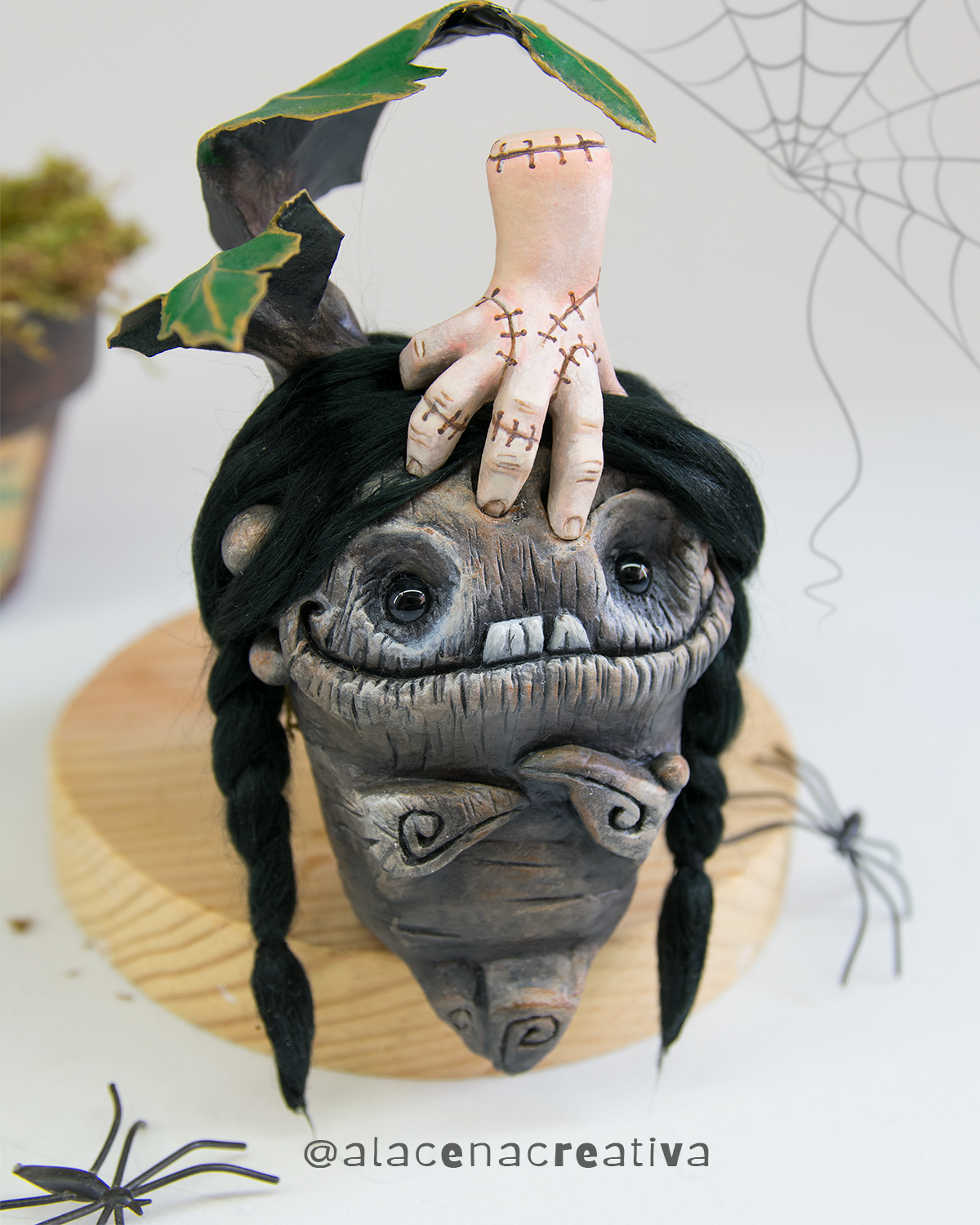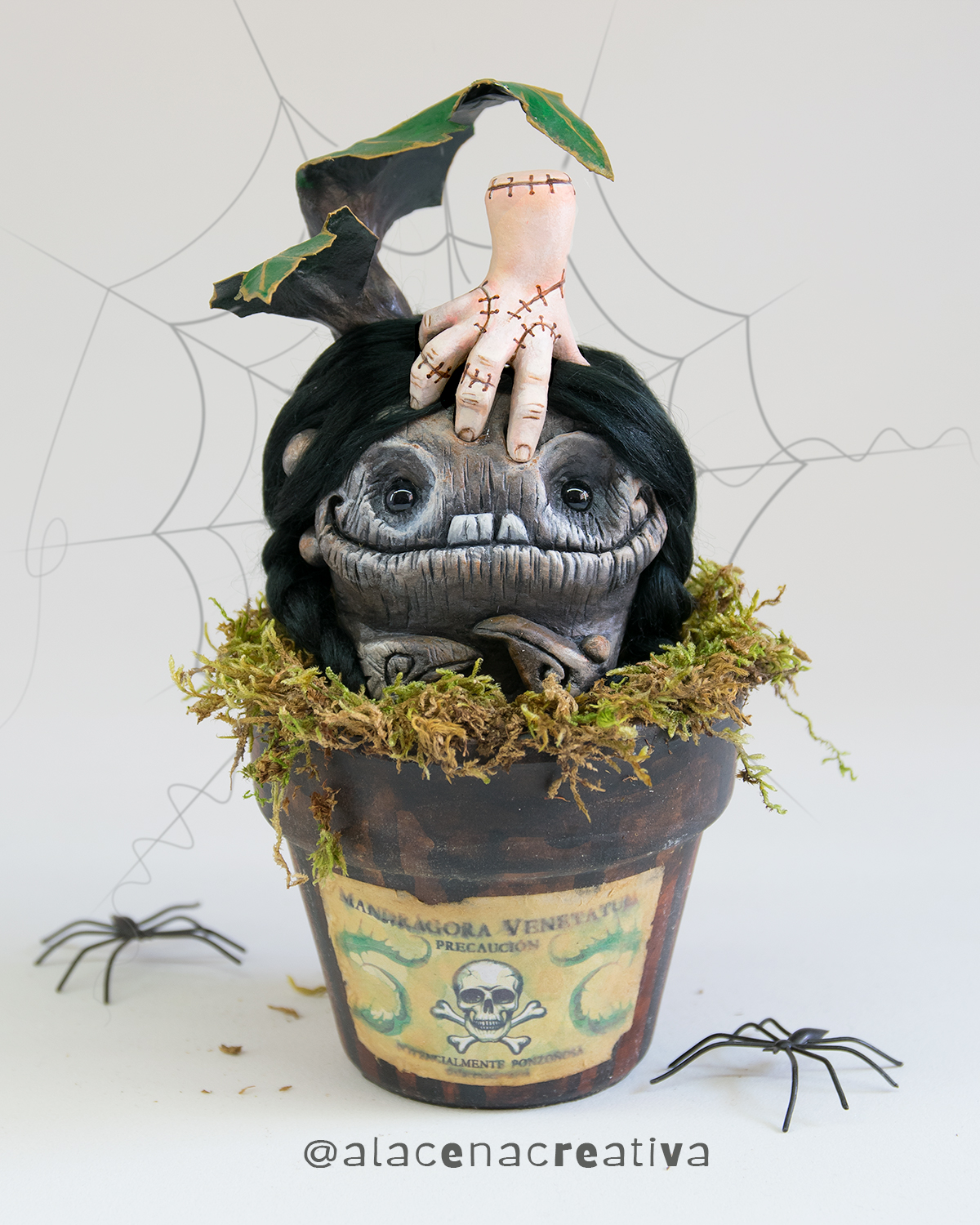 Figura decorativa inspirada en Miércoles Addams, un personaje misterioso que me ha ayudado a crear una mandrágora igual de misteriosa y que oculta oscuros secretos; te contaré uno: por las noches caza energías negativas para guardarlas en tarritos; quién sabe, algún día quizá tenga que «utilizarlas».